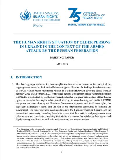 У цій інформаційній записці висвітлюється ситуація з правами людини літніх осіб у контексті збройного нападу Російської Федерації на Україну, який триває. Наведені в ній факти, основані на роботі Моніторингової місії ООН з прав людини в Україні (ММПЛУ), охоплюють період із 24 лютого 2022 року до 28 лютого 2023 року. Хоча літні особи стикалися з проявами вразливості ще до 2022 року, збройний напад Російської Федерації призвів до серйозного погіршення ситуації з їхніми правами людини, зокрема з правами на життя, соціальне забезпечення, достатнє житло та здоров’я. ММПЛУ визнає кроки, здійснені Урядом України для захисту та реалізації цих прав, значні виклики, з якими він стикається, і роль міжнародної спільноти в наданні допомоги Урядові. У цій записці викладено рекомендації Російській Федерації, Україні та міжнародній спільноті, зокрема донорам, які мають на меті забезпечити, щоб їхні дії та програми охоплювали літніх осіб і сприяли реалізації прав цих осіб у спосіб, який посилює їхню суб’єктність і гідність в умовах бойових дій, а також у процесі раннього відновлення та відбудови.